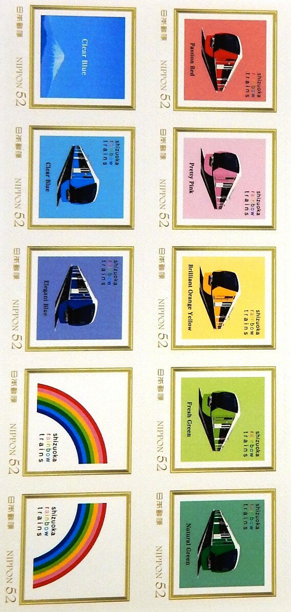 当社創立100周年を迎える2019年度までに導入してまいります新型車両7編成の「静岡レインボートレインズ」をデザインした切手と、静岡が誇るいろいろないちばんをモチーフにした「静岡レインボートレインズ」の7色を表現した専用台紙のセット商品です。