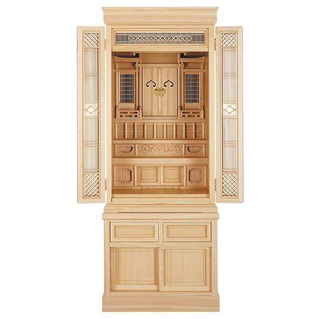 お祀りに便利なスライド式の棚板と、収納に便利な引き出しが付いています。