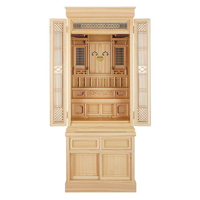 お祀りに便利なスライド式の棚板と、収納に便利な引き出しが付いています。