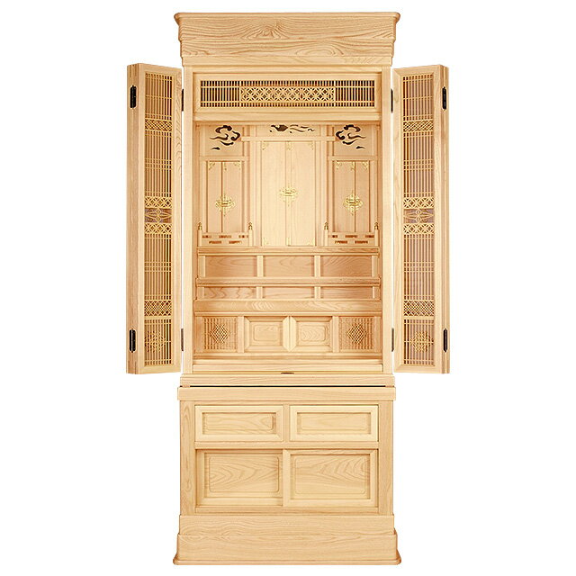 外寸法:高さ172cm×巾72cm×奥行62cm内扉奥(お宮)の内部寸法:高さ57cm×巾59cm×奥行11cm内扉(お宮)開口寸法:高さ37cm×巾17cm材質:栓材(国産)正面表面材:台輪−栓材無垢 戸板−組子障子ガラス入り 大戸軸−栓材無垢主芯材:天然木材表面仕上げ:ウレタン仕上げ(クリア塗装)重量:約63kg (上台 約45kg、下台 約18kg)備考:神具セット付き 扉ガラス入り・スライド式棚板・引き出し付き生産地:日本製(会津)全国どこでも送料無料で配送いたします。