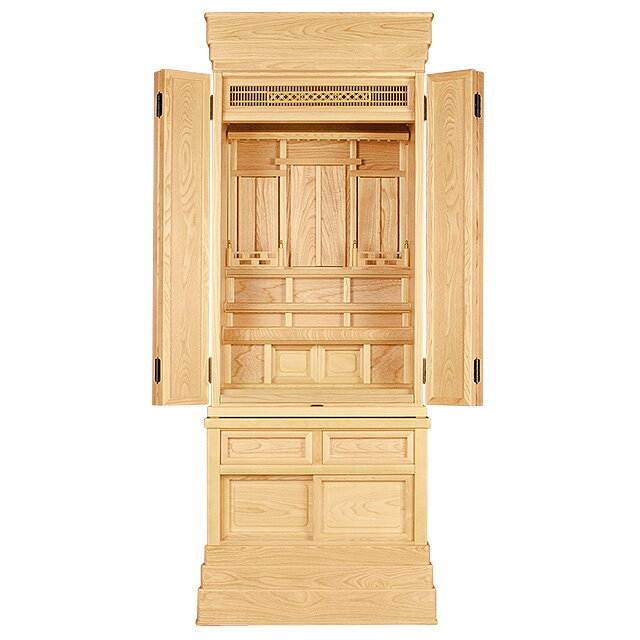 外寸法:高さ172cm×巾69cm×奥行59cm内扉奥(お宮)の内部寸法:高さ51cm×巾56cm×奥行11cm内扉(お宮)開口寸法:高さ31cm×巾13cm材質:栓材(国産)正面表面材:台輪−栓材無垢 戸板−栓材薄板貼り 大戸軸−栓材無垢主芯材:天然木材表面仕上げ:ウレタン仕上げ(クリア塗装)重量:約60kg (上台 約41kg、下台 約19kg)備考:神具セット付き スライド式棚板・引き出し付き生産地:日本製(会津)全国どこでも送料無料で配送いたします。