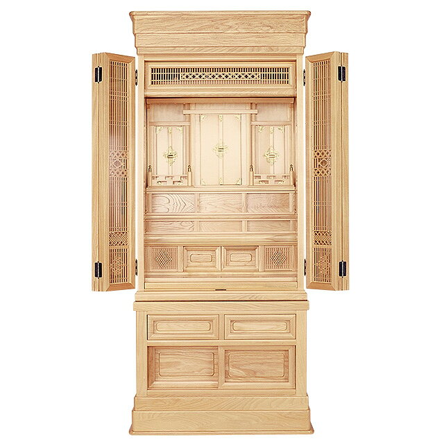 外寸法:高さ152cm×巾67cm×奥行60cm内扉奥(お宮)の内部寸法:高さ45cm×巾58cm×奥行9cm内扉(お宮)開口寸法:高さ29cm×巾14.5cm材質:栓材(国産)正面表面材:台輪−栓材無垢 戸板−組子障子ガラス入り 大戸軸−栓材無垢主芯材:天然木材表面仕上げ:ウレタン仕上げ(クリア塗装)重量:約54kg (上台 約37kg、下台 約17kg)備考:神具セット付き 扉ガラス板入り・スライド式棚板・引き出し付き生産地:日本製(会津)全国どこでも送料無料で配送いたします。