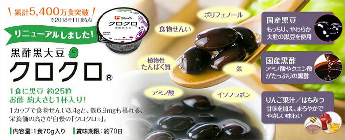 原材料名 黒大豆(遺伝子組換えでない)、りんご濃縮果汁、りんご酢、砂糖、還元水あめ、米黒酢、はちみつ、難消化性デキストリン(水溶性食物繊維)、(一部に大豆・りんごを含む) 主原料原産地 滋賀県(黒豆)、日本(りんご濃縮果汁、りんご酢、米黒酢)、アルゼンチン(はちみつ) 栄養成分 1食(70g)あたり エネルギー99kcal/ たんぱく質4.4g、脂質1.8g、炭水化物17.6g(糖質14.2g、食物繊維3.4g)、食塩相当量0.1g、カルシウム14mg、鉄6.9mg、大豆イソフラボン(アグリコン換算)13mg、酢酸616mg、ポリフェノール42mg この表示値は、目安です。